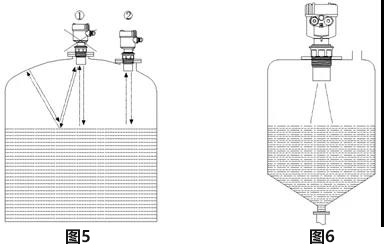 6、對(duì)于頂部為平面的錐形容器,四線(xiàn)制超聲波液位計(jì)應(yīng)盡量安裝在頂部中央,這樣可以保證測(cè)量到容器底部,如圖6所示。